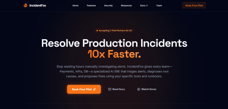 IncidentFox gives every team a specialized AI SRE that triages alerts, diagnoses root causes, and proposes fixes using your specific tools and runbooks.