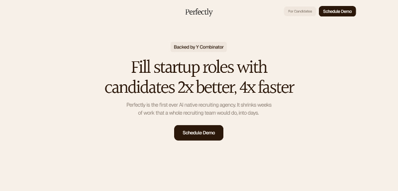 Perfectly (YC W26) fills roles by using AI to automate the grunt work of finding, reaching out to, and screening qualified candidates so recruiters can focus on providing the highest quality candidate.